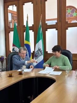 A prefeita Darlene Pereira sancionou, nesta quinta-feira (30), a Lei nº 9.358, que trata da concessão do antigo prédio dos Correios ao Sesc/RS. Com isso, o Sesc será responsável pela revitalização do prédio, localizado em frente à Catedral de São Pedro, para a futura instalação de uma escola de educação infantil. O ato contou com a presença do presidente do Fecomércio/RS, Luiz Carlos Bohn.
