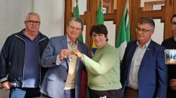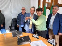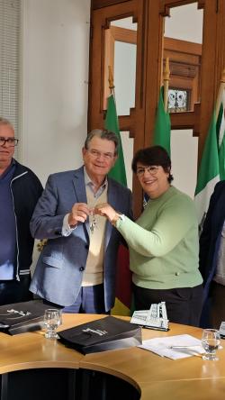 Durante o ato, a prefeita entregou o termo de cessão de uso e a chave do imóvel ao presidente da Fecomércio/RS, Luiz Carlos Bohn, simbolizando o início de uma nova etapa para o espaço histórico.