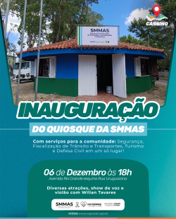 A Secretaria de Município de Mobilidade, Acessibilidade e Segurança (SMMAS) inaugura, neste sábado (6), às 18h, o Quiosque da SMMAS, base avançada da Secretaria que irá funcionar no Balneário Cassino. O espaço está localizado na Avenida Rio Grande, esquina com a Rua Uruguaiana, e foi preparado para oferecer serviços integrados à comunidade durante todo o veraneio. Logo após o ato, serão acesas as Luzes de Natal do Cassino, decoração instalada ao longo da Avenida Rio Grande.