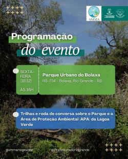 Na sexta-feira, 19, às 16h, ocorrerá a abertura do Parque Urbano do Bolaxa. A programação contará com trilhas, além de uma roda de conversa sobre o parque e a Área de Proteção Ambiental – APA da Lagoa Verde.