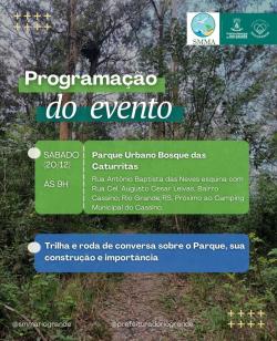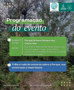 Já no sábado, 20, às 9h, será aberto o Parque Urbano Bosque das Caturritas, próximo ao Camping Municipal do Cassino. Também será realizada uma trilha no local e uma roda de conversa sobre o parque, sua construção e importância.