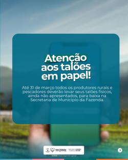 Até o dia 31 de março, todos os produtores rurais e pescadores deverão levar seus talões físicos, ainda não apresentados, para baixa na Secretaria de Município da Fazenda.