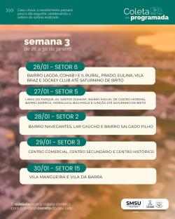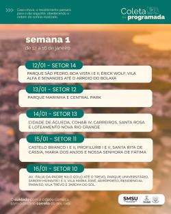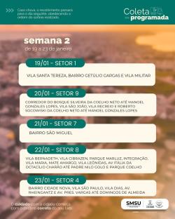 A SMSU informa que, em razão do período de Carnaval, e da necessidade de realizar ajustes técnicos para manter a eficiência do serviço, após concluída a etapa de janeiro/fevereiro, a Coleta Programada será retomada no dia 2 de março.