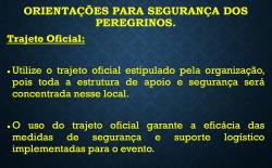 Durante a caminhada, é importante seguir as orientações dos órgãos oficiais, como por exemplo, caminhar pelo lado contrário ao fluxo de veículos. Além disso, os peregrinos devem caminhar em fila indiana, um atrás do outro.