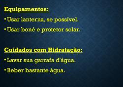 Órgãos de Segurança também orientaram sobre os equipamentos que devem ser usados pelos caminhantes. Levar uma lanterna, se possível, é recomendável quando for caminhar em horários com menor iluminação. O uso de boné e de protetor solar não devem ser descartados.