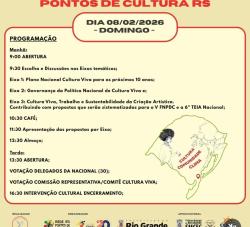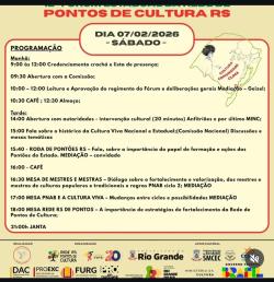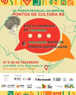 Acontece em Rio Grande, no sábado (7) e no domingo (8), o 12º Fórum de Pontos de Cultura. O evento ocorre no Centro de Convívio dos Meninos do Mar CCMAR, a partir das 9h nos dois dias. O objetivo principal é discutir as pautas elencadas como eixos temáticos e eleger os delegados que irão representar o RS no Fórum nacional, que acontece no mês de março.