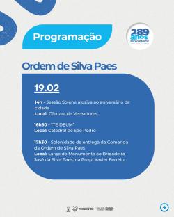 Na quinta-feira (19), a partir das 14h, na Câmara de Vereadores, acontece a Sessão Solene alusiva ao aniversário. Mais tarde, 16h30, a Catedral de São Pedro recebe a cerimônia “Te Deum”. Já a solenidade de entrega da Comenda da Ordem de Silva Paes tem início previsto para as 17h30, no Largo do Monumento ao Brigadeiro José da Silva Paes, na Praça Xavier Ferreira.