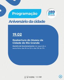 Ainda na quinta-feira o Museu da Cidade do Rio Grande terá sua reabertura oficial após o impacto da enchente de 2024. O funcionamento será das 9h às 12h e das 13h às 17h.