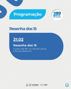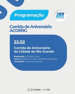 No domingo (22) as celebrações do aniversário encerram com mais uma da Corrida de Aniversário da Cidade do Rio Grande, promovida pela Associação dos Corredores de Rua do Rio Grande – ACORRG, em parceria com Sesc e Prefeitura. As inscrições continuam abertas até as 12h de sexta-feira, pelo WhatsAPP 53 999583936.