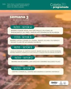 A Prefeitura do Rio Grande divulgou o cronograma da próxima etapa da Coleta Programada, que será realizada de 2 de março a 2 de abril. A proposta, desenvolvida pela Secretaria de Serviços Urbanos (SMSU), consiste em um modelo extra de recolhimento de resíduos, criado para facilitar o descarte correto de entulhos, móveis velhos, eletrodomésticos, eletroeletrônicos inutilizados, entre outros itens.