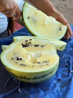A melancia representa o resultado de meses de dedicação dos agricultores, que dominam o tempo do preparo do solo e da colheita. De origem africana, a fruta tem registros de consumo humano há cerca de 4 mil anos, no antigo Egito, e chegou ao Brasil com os povos africanos escravizados e colonizadores europeus.
