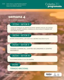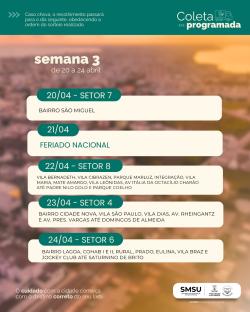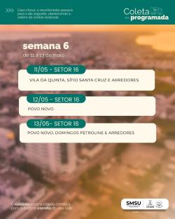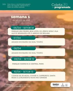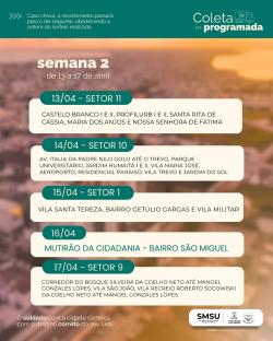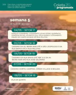 Em função das condições climáticas previstas para os próximos dias, a Secretaria de Serviços Urbanos informa a alteração no cronograma da Coleta Programada. Conforme previamente pactuado com as associações de moradores (URAB a CURG), em dias de chuva, a coleta será transferida para o dia seguinte com tempo firme, mantendo a ordem do cronograma. Confira o calendário até 13 de maio nos cards em anexo.