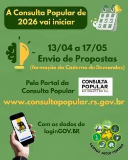 Criada em 1998, a Consulta Popular é um dos principais instrumentos de participação cidadã no Rio Grande do Sul, permitindo que a população contribua diretamente na definição das prioridades regionais e na destinação de parte dos recursos do orçamento estadual. Ao longo dos anos, o programa se consolidou como uma forma de aproximar o cidadão das decisões públicas e ampliar a participação social.