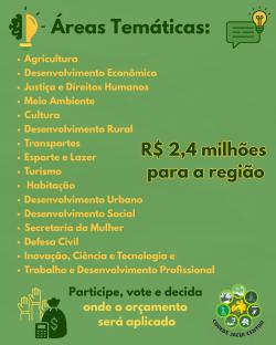 Na etapa inicial, moradores de todas as regiões do Rio Grande do Sul podem encaminhar propostas relacionadas a diferentes áreas, como saúde, educação, infraestrutura, agricultura, cultura, entre outras, conforme as demandas locais.