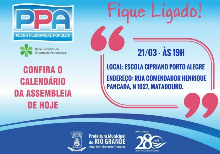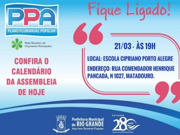 O Executivo Municipal dará início, amanhã (21/3), às assembleias públicas do Plano Plurianual (PPA), para debater com os munícipes assuntos como investimento de recursos públicos e prestação de contas. A assembleia será realizada na Escola Municipal Cipriano Porto Alegre, às 19h00min.