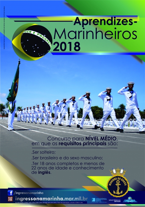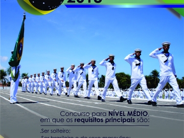 Começou em 1º de fevereiro, a inscrição para o Concurso Público de Admissão às Escolas de Aprendizes-Marinheiros (CPAEAM), com o total de 1.000 vagas. Dentre os requisitos principais, o interessado dever ser brasileiro nato ou naturalizado, do sexo masculino, com 18 anos completos e menos de 22 anos de idade, no dia 1º de janeiro 2019, além de ter o Ensino Médio. Os aprovados em todas as fases do concurso receberão rendimentos iniciais brutos de cerca de R$ 2 mil.