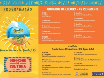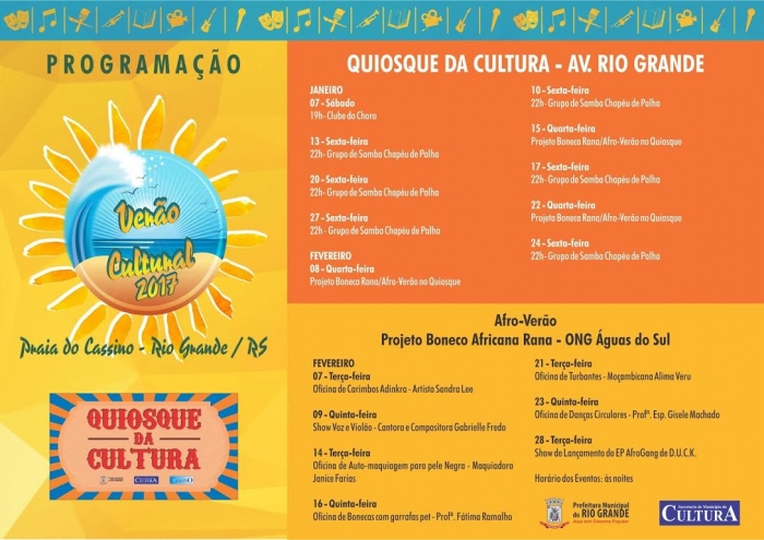 O Executivo Municipal, por meio da Secretaria da Cultura (SeCult), convida a comunidade para o seguimento das atividades no Quiosque da Cultura, localizado no canteiro central da Avenida Rio Grande, na entrada do Balneário Cassino. O projeto terá como atração nesta sexta-feira (20) o grupo de samba Chapéu de Palha.