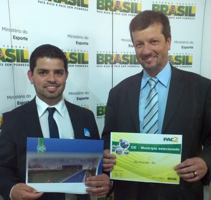 O Parque Marinha, segundo bairro mais populoso do município do Rio Grande, foi contemplado com um Centro de Iniciação ao Esporte (CIE) do Ministério do Esporte. A boa notícia foi dada pelo Prefeito Alexandre Lindenmeyer, que participou da solenidade de anúncio dos municípios selecionados em Brasília nesta terça-feira (10). Ele esteve acompanhado pelo Assessor de Governo, Rubilar Tavares (Juquinha) – um dos responsáveis pela elaboração da proposta e elaboração dos documentos necessários para o cadastramento da proposta.