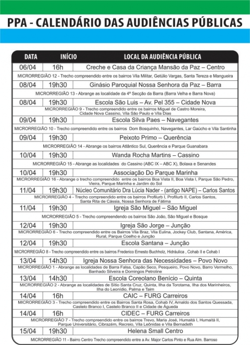Entre os dias 6 e 15 de abril estarão acontecendo as audiências públicas do Plano Plurianual (PPA), uma oportunidade para que a população possa interagir no debate que decide os rumos do município. Nas audiências do PPA é feito o debate das prioridades das ações do governo municipal. A participação da comunidade é fundamental para que se possa construir uma cidade melhor.