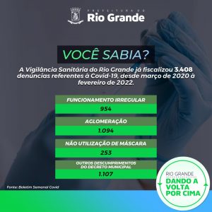 Por outro lado, a Vigilância Sanitária da Secretaria da Saúde do Rio Grande já fiscalizou 3.408 denúncias recebidas referentes à Covid-19, desde março de 2020 a fevereiro deste ano. Os casos envolvem funcionamento irregular de estabelecimentos (954 casos); aglomeração (1.094 denúncias); não utilização da máscara (253 casos); e 1.107 denúncias relativas a outros descumprimentos dos decretos municipais.