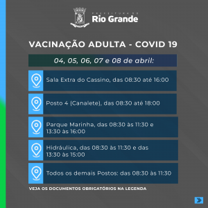 Para adolescentes e adultos, as doses estarão disponíveis na sala extra do Cassino (Av. Rio Grande, 67), no Posto IV (Canalete), nos postos de Saúde do Parque Marinha e da Hidráulica. Nestes locais os horários são diferenciados. Nos demais postos, o atendimento é das 8h30min e das 11h30min.