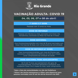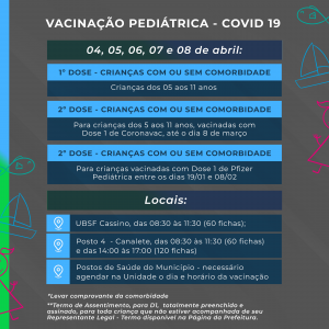 A Secretaria da Saúde divulgou a programação para vacinar crianças, adolescentes e adultos, a partir desta segunda-feira (4) e até sexta-feira (8). Para crianças na faixa de 5 a 11 anos, as vacinas vão ser aplicadas na UBSF Cassino e no Posto IV (Canalete). Para receber a dose nos postos de Saúde, é necessário fazer agendamento de dia e horário para receber a vacina. Em todos os locais é imprescindível a apresentação de documentos de identidade.