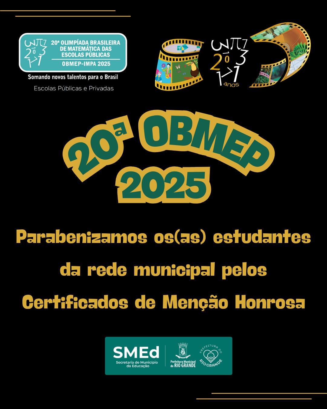 A Secretaria de Município da Educação (SMEd) parabeniza os/as estudantes de 6º ao 9º ano do Ensino Fundamental das escolas municipais pelo Certificado de Menção Honrosa na 20ª Olimpíada Brasileira de Matemática das Escolas Públicas – OBMEP 2025.