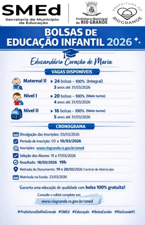A Prefeitura Municipal do Rio Grande, através da Secretaria de Município da Educação, torna público o Edital de SELEÇÃO PÚBLICA Nº 05/2026 para preenchimento de vagas, (Educação Infantil), com bolsa de estudo em escola da Rede Privada conveniada com o município para o ano letivo de 2026, EDUCANDÁRIO CORAÇÃO DE MARIA