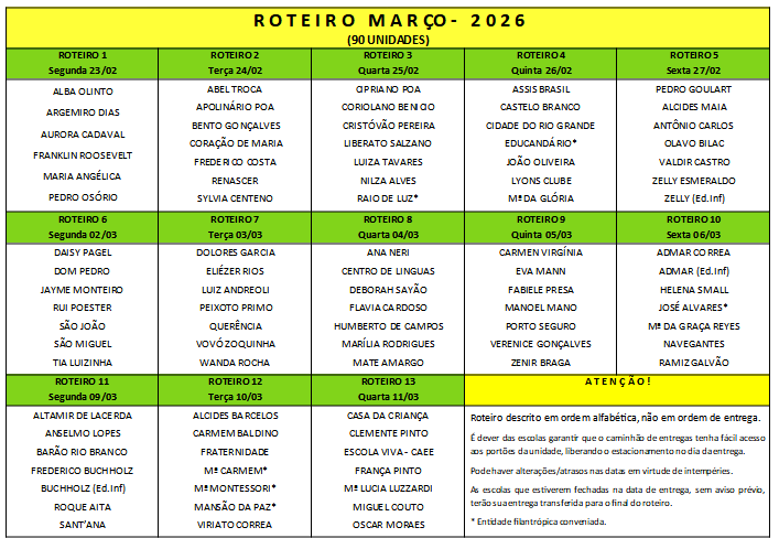 Os cardápios passam a valer em cada unidade de ensino a partir do dia de recebimento do Roteiro do mês.
